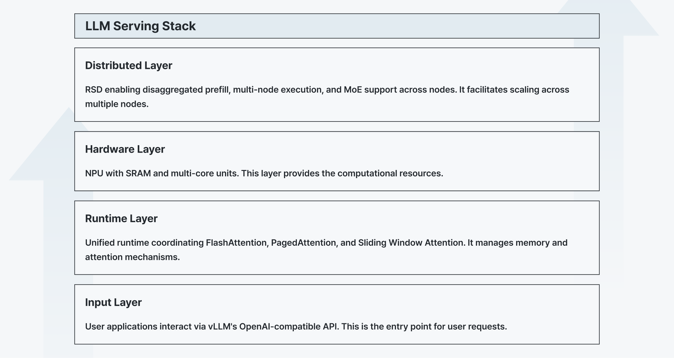 Modern LLMs rely on advanced attention mechanisms such as FlashAttention, PagedAttention, and Sliding Window Attention to achieve high throughput, low latency, and long context support. Frameworks like vLLM abstract these mechanisms for GPU-based serving, leveraging CUDA for fast memory access and parallel computation. However, reliance on GPUs increases power and costs, limiting portability to other architectures such as NPUs.