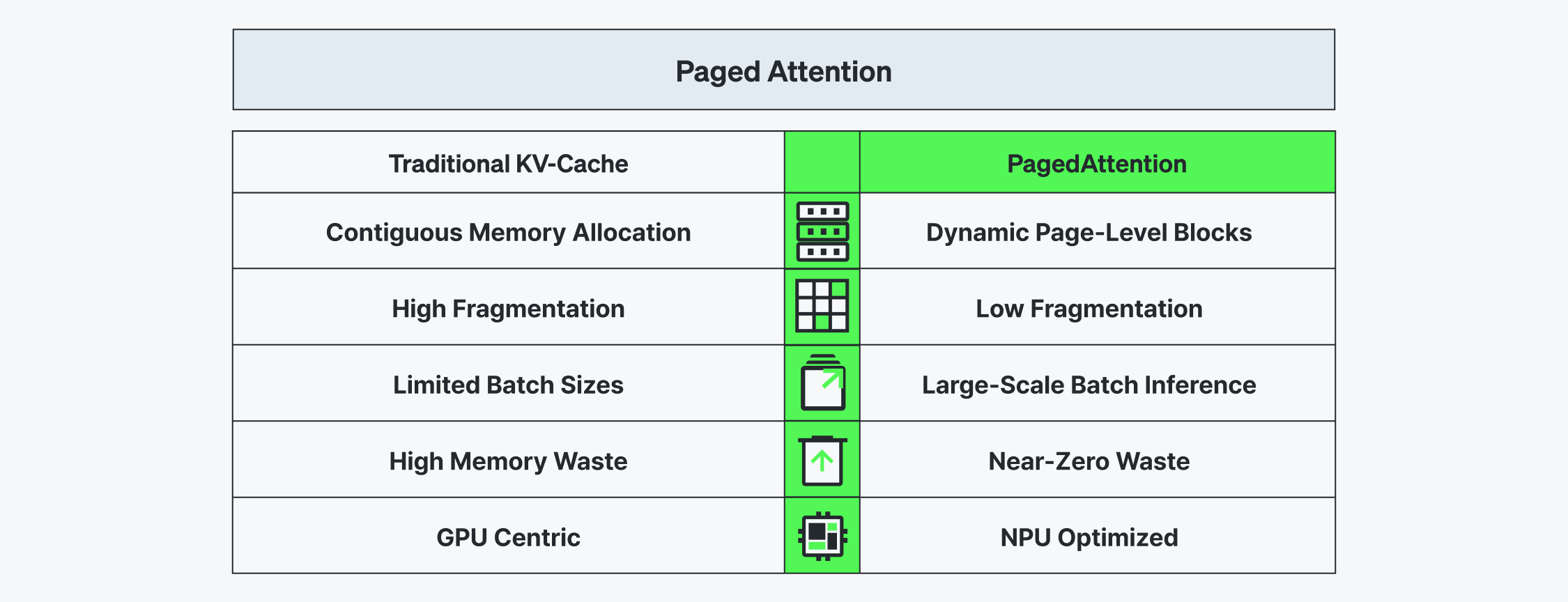 Rebellions implements PagedAttention with kernel-level support for memory management based on KV blocks. Partition size is configurable, with default values optimized via optimum-rbln to balance performance and memory footprint.