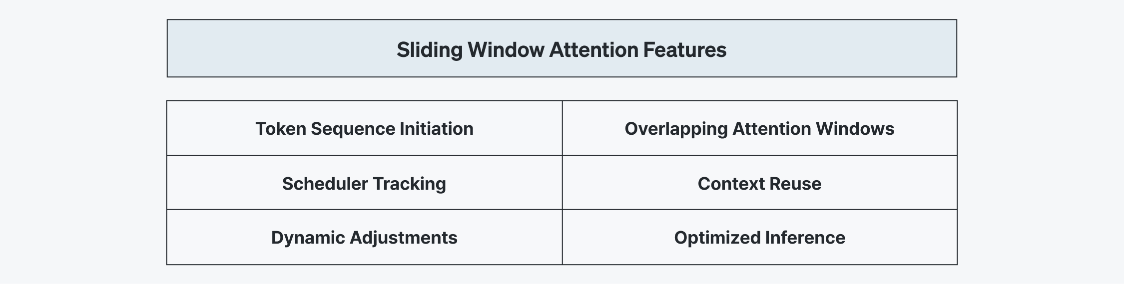 Sliding Window Attention enables long-context and streaming inference by restricting attention to a fixed-size window. Instead of storing the full history, it maintains only the most recent tokens needed for the current step, significantly reducing memory pressure.