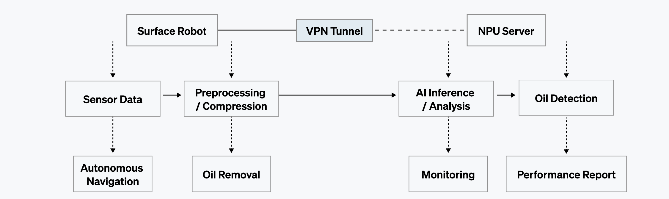 ECOPEACE implemented an intelligent water purification robot system utilizing a central server powered by the Rebellions ATOM™ NPU. When the ECOBOTs operating at Dubai’s Al Jadaf Port transmit captured video data, the NPU server located in Abu Dhabi performs precise identification via object detection models while simultaneously calculating 3D distances through depth estimation models. Upon receiving these results, the robots approach the pollutants and activate oil recovery pumps to perform suction and filtration via internal oil-water separation components and filter designs.
