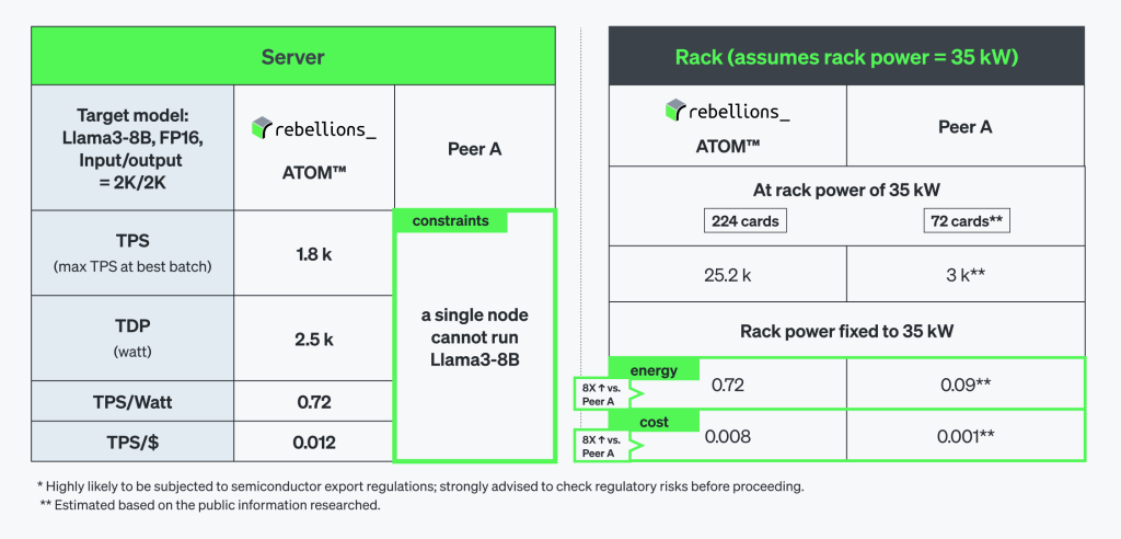 Llama3-8B results emphasize the power efficiency of RSD compared to competitors on the market. With a single ATOM™ server delivering 1800 TPS at 2,500 watts, the throughput scales to 25,200 at the rack-level with 224 ATOM™ cards. The gains become even more impressive at a larger scale, with RSD achieving over 8x gains in both energy and cost, as measured by TPS/Watt and TPS/$, respectively.