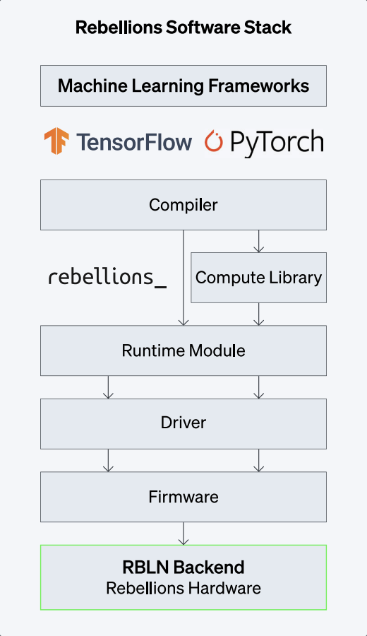 RBLN SDK includes Rebellions’ proprietary Compiler, Compute Library, Runtime, Drivers, and Firmware, engineered to facilitate seamless integration of pre-trained models from frameworks such as TensorFlow, PyTorch or the Hugging Face ecosystem into Rebellions’ chip-based serving environment. All the components in the Software Stack serve to render the lowest latency possible.