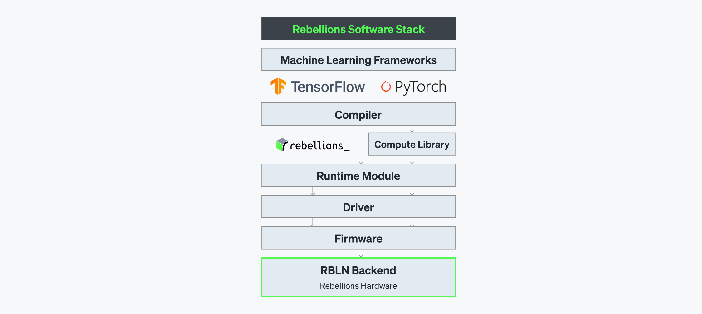 RBLN SDK includes Rebellions’ proprietary Compiler, Compute Library, Runtime, Drivers, and Firmware, engineered to facilitate seamless integration of pre-trained models from frameworks such as TensorFlow, PyTorch or the Hugging Face ecosystem into Rebellions’ chip-based serving environment. All the components in the Software Stack serve to render the lowest latency possible.