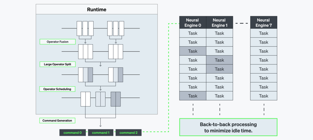 - Tiling: The split operations are further divided across the Neural Engines to achieve the most efficient performance.